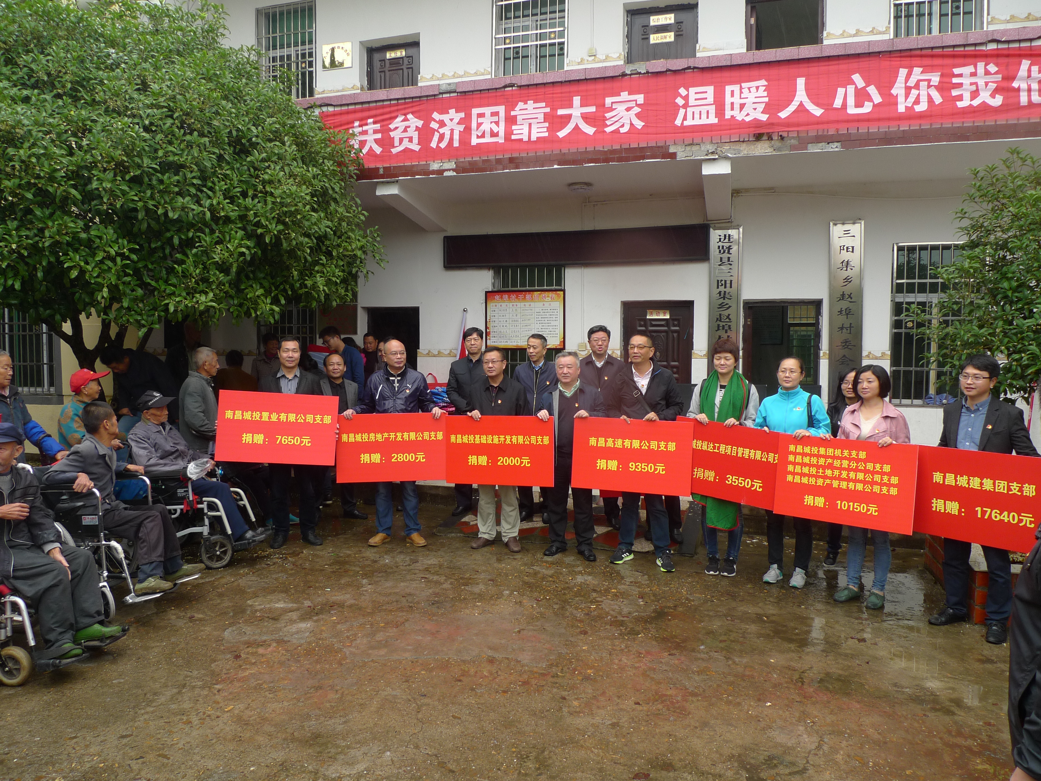 金秋十月,細(xì)雨紛飛。在三陽(yáng)集鄉(xiāng)趙埠村委里,涂董一行熱情洋溢,與鄉(xiāng)黨委副書記、鄉(xiāng)長(zhǎng)羅國(guó)亮一起為趙埠村黨支部黨員活動(dòng)中心舉行揭牌儀式,并捐贈(zèng)辦公桌椅及會(huì)議桌,價(jià)值近1.6萬(wàn)元。給106戶困難家庭發(fā)放慰問(wèn)金21200元,為建檔立卡困難戶發(fā)放過(guò)冬棉被20套、為貧困家庭孩子們送上學(xué)習(xí)用品8套、向殘障人捐贈(zèng)殘疾人器具(輪椅、助行器、拐杖、盲杖)34件。同時(shí),捐上由南昌城投集團(tuán)公司員工所募集的54990元慰問(wèn)金。